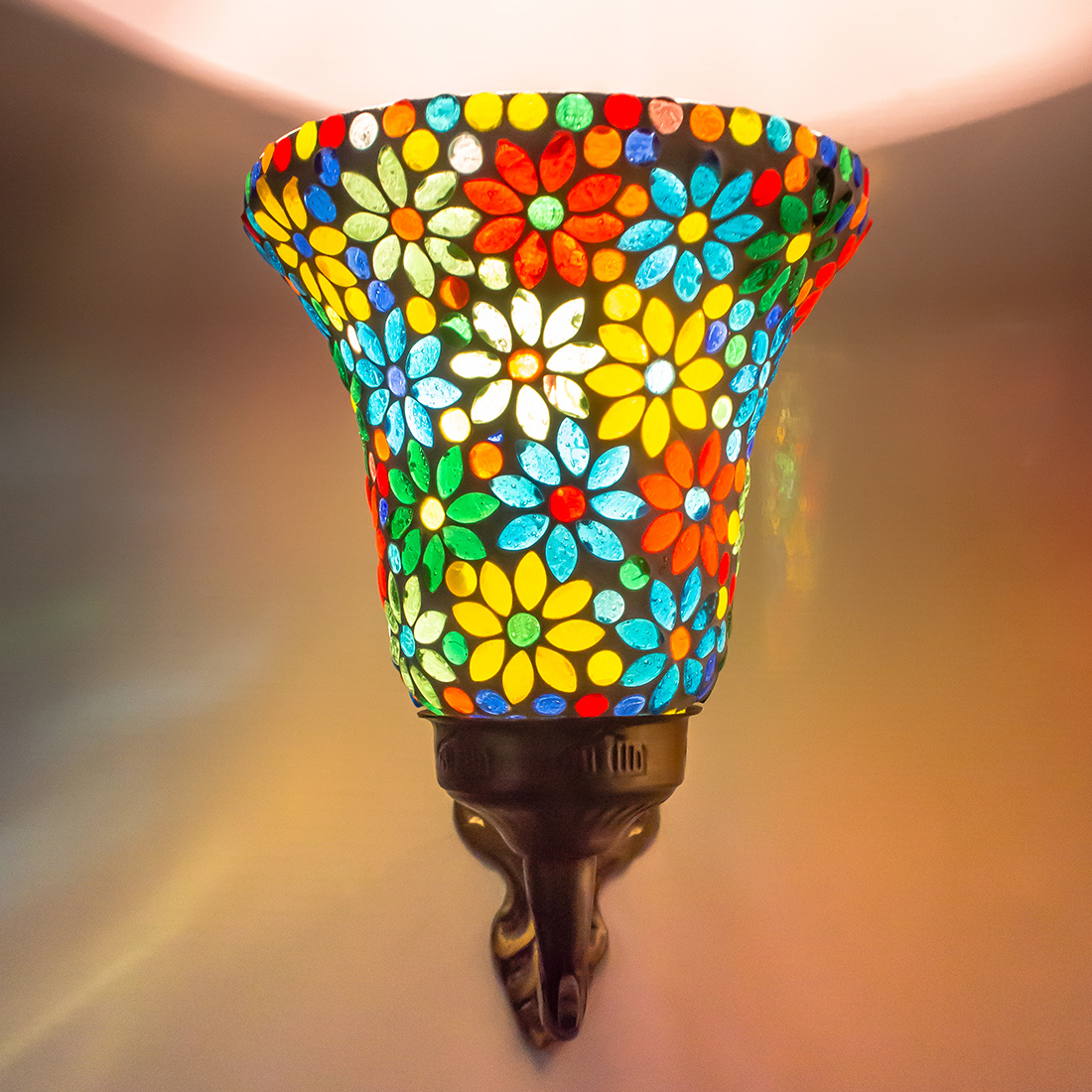 Transform your living space with this exquisite handcrafted mosaic glass wall sconce. The stunning lamp features a mesmerising pattern of multi-coloured glass pieces, artfully arranged to create a dazzling display of light and colour. The vintage-style metal base adds a touch of classical elegance, while its intricate scrollwork complements the vibrant mosaic design above. When illuminated, the sconce casts enchanting patterns of coloured light, creating a warm and inviting atmosphere in any room. The combination of multicolored glass pieces creates a striking visual impact, making it an ideal accent piece for entryways, corridors, or living areas. This decorative light fixture serves both as a functional lighting solution and a stunning piece of wall art. The robust construction ensures durability, while the timeless design makes it a versatile addition to both traditional and contemporary décor schemes. Each piece showcases unique artisanal craftsmanship, making it a distinctive addition to your home lighting collection.