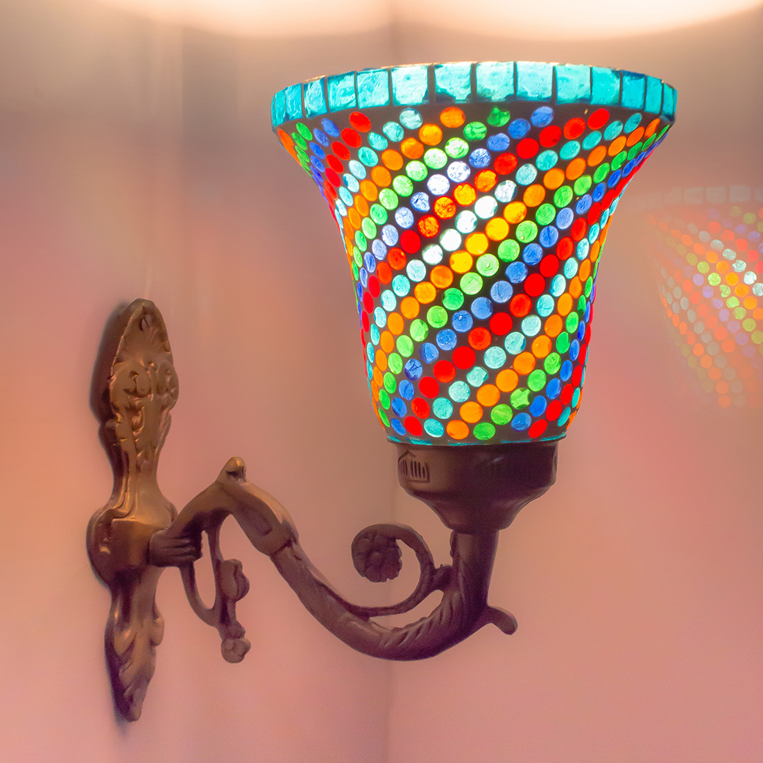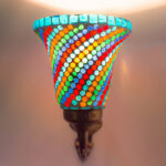 Transform your living space with this exquisite handcrafted mosaic glass wall sconce. The stunning lamp features a mesmerising pattern of multi-coloured glass pieces, artfully arranged to create a dazzling display of light and colour. The vintage-style metal base adds a touch of classical elegance, while its intricate scrollwork complements the vibrant mosaic design above. When illuminated, the sconce casts enchanting patterns of coloured light, creating a warm and inviting atmosphere in any room. The combination of multicolored glass pieces creates a striking visual impact, making it an ideal accent piece for entryways, corridors, or living areas. This decorative light fixture serves both as a functional lighting solution and a stunning piece of wall art. The robust construction ensures durability, while the timeless design makes it a versatile addition to both traditional and contemporary décor schemes. Each piece showcases unique artisanal craftsmanship, making it a distinctive addition to your home lighting collection.