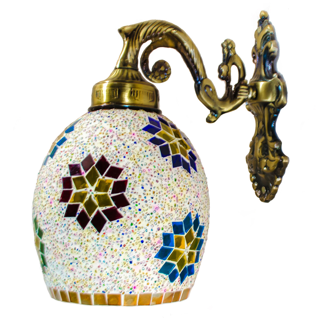 Transform your living space with this exquisite handcrafted mosaic glass wall sconce. The stunning lamp features a mesmerising pattern of multi-coloured glass pieces, artfully arranged to create a dazzling display of light and colour. The vintage-style metal base adds a touch of classical elegance, while its intricate scrollwork complements the vibrant mosaic design above. When illuminated, the sconce casts enchanting patterns of coloured light, creating a warm and inviting atmosphere in any room. The combination of multicolored glass pieces creates a striking visual impact, making it an ideal accent piece for entryways, corridors, or living areas. This decorative light fixture serves both as a functional lighting solution and a stunning piece of wall art. The robust construction ensures durability, while the timeless design makes it a versatile addition to both traditional and contemporary décor schemes. Each piece showcases unique artisanal craftsmanship, making it a distinctive addition to your home lighting collection.