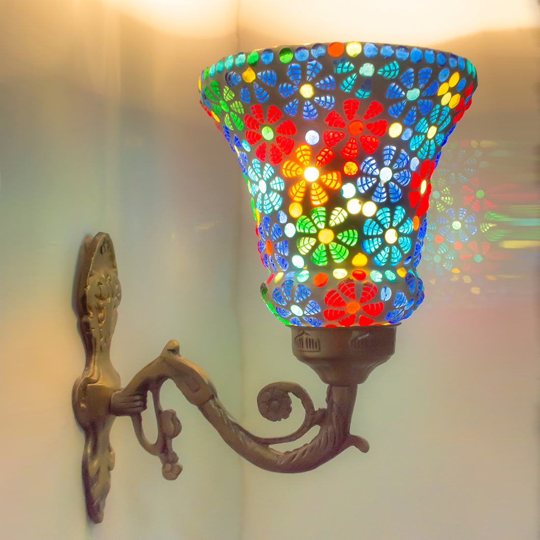 DEVBEADS Mosaic Glass Wall Sconce, Decorative Handcrafted Lamp with Multi-Coloured Design, Vintage-Style Metal Bracket