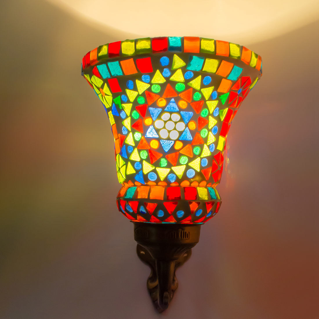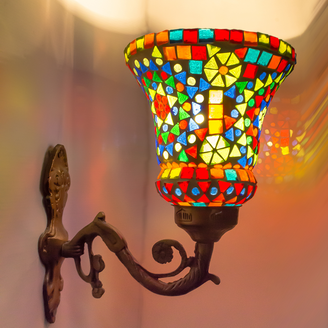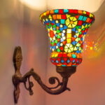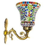 Transform your living space with this exquisite handcrafted mosaic glass wall sconce. The stunning lamp features a mesmerising pattern of multi-coloured glass pieces, artfully arranged to create a dazzling display of light and colour. The vintage-style metal base adds a touch of classical elegance, while its intricate scrollwork complements the vibrant mosaic design above. When illuminated, the sconce casts enchanting patterns of coloured light, creating a warm and inviting atmosphere in any room. The combination of multicolored glass pieces creates a striking visual impact, making it an ideal accent piece for entryways, corridors, or living areas. This decorative light fixture serves both as a functional lighting solution and a stunning piece of wall art. The robust construction ensures durability, while the timeless design makes it a versatile addition to both traditional and contemporary décor schemes. Each piece showcases unique artisanal craftsmanship, making it a distinctive addition to your home lighting collection.