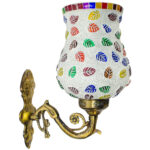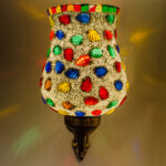 Transform your living space with this exquisite handcrafted mosaic glass wall sconce. The stunning lamp features a mesmerising pattern of multi-coloured glass pieces, artfully arranged to create a dazzling display of light and colour. The vintage-style metal base adds a touch of classical elegance, while its intricate scrollwork complements the vibrant mosaic design above. When illuminated, the sconce casts enchanting patterns of coloured light, creating a warm and inviting atmosphere in any room. The combination of multicolored glass pieces creates a striking visual impact, making it an ideal accent piece for entryways, corridors, or living areas. This decorative light fixture serves both as a functional lighting solution and a stunning piece of wall art. The robust construction ensures durability, while the timeless design makes it a versatile addition to both traditional and contemporary décor schemes. Each piece showcases unique artisanal craftsmanship, making it a distinctive addition to your home lighting collection.